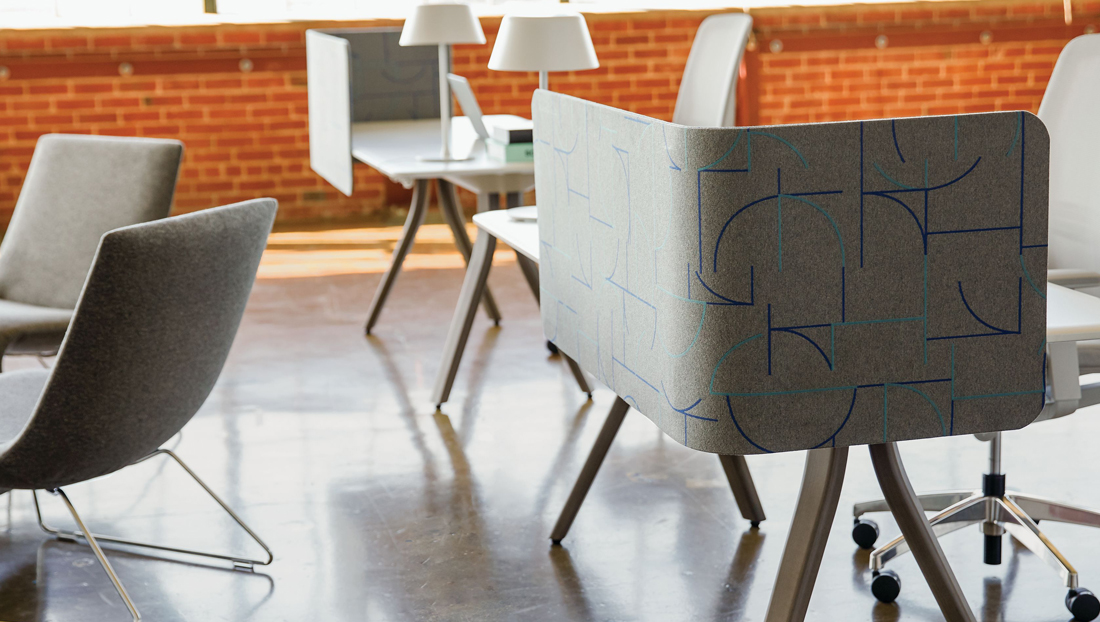 Slim and lightweight, Infinity Screens are offered in straight or curved versions. They measure a ½-inch thick (1.27 cm), are available in a variety of heights and modesty levels, and mount to any desk. The collection can be upholstered in a variety of select fabrics.
