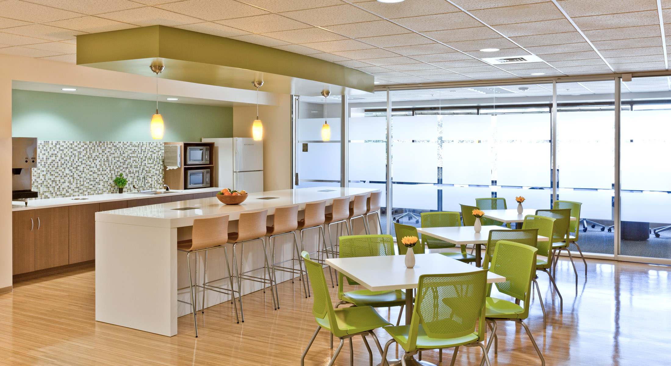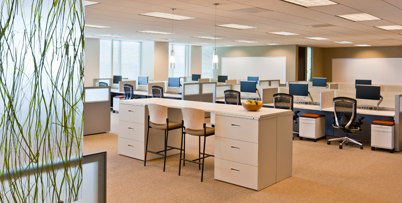 additional space for conference areas, training rooms, a new “healthful eating” café and a multi-purpose e-café on each floor for socializing, working and collaborating.Support services, such as a printers and copiers, are centrally located to conserve energy and encourage interaction.