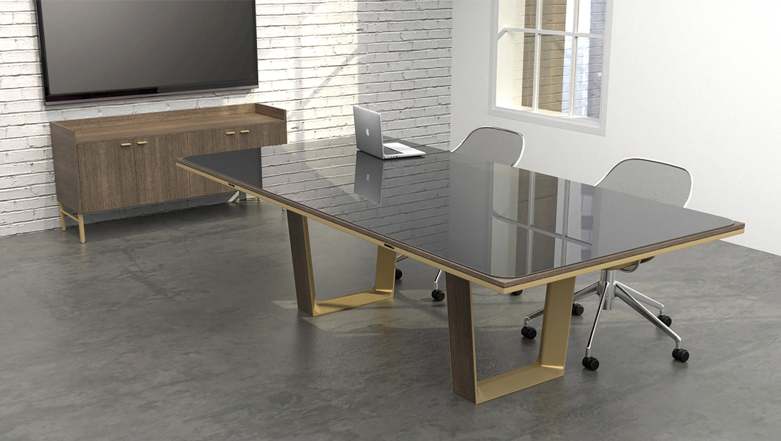 C+D features multiple leg, power and edge profile selections. Four leg/base styles, including metal loop legs with wood accents on the exterior and interior infill panels, provide integrated wire management. The table’s unique layered top and edge style imparts a warm yet functional aesthetic. Standard top layers include wood, back-painted glass and Corian. Top layers are applied over a durable solid wood edge. C+D is designed and engineered to accommodate a variety of sizes and top materials.