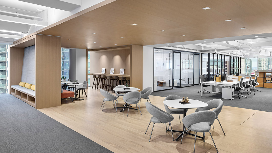 Agile − the newest area − is open, fluid and community-based. Worktables and furnishings can be moved about freely to demonstrate the concept of agility in a workspace. Floor-to-ceiling Luum Textiles draperies emphasize the 11-foot (3.35m) height of the space and are used to control light, divide space and enhance presentations. Biophilic design elements include floor-to-ceiling windows that admit a plenitude of natural light and permit vistas of the urban landscape and Lake Ontario. Custom overhead lighting simulates sunlight in a floating, glass-enclosed conference room, the Aquarium. Warm wood cladding, wood accents and flooring allow guests to appreciate the patterns and textures of natural materials.