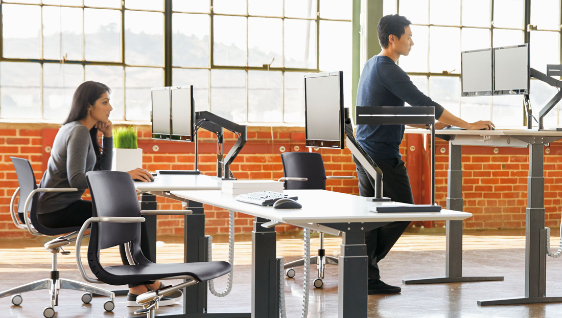 Swerv Monitor Arm IC (Integrated Cerebro) is designed to be used with a Teknion electric height-adjustable table, built-in or wall unit that uses a Linak electric linear actuator system inside. Using a Teknion-specific custom digital switch, the user sets their “delta” – the difference in eye to typing height between seated and standing – then the monitor arm will automatically adjust this delta when transitioning between seated and standing work.