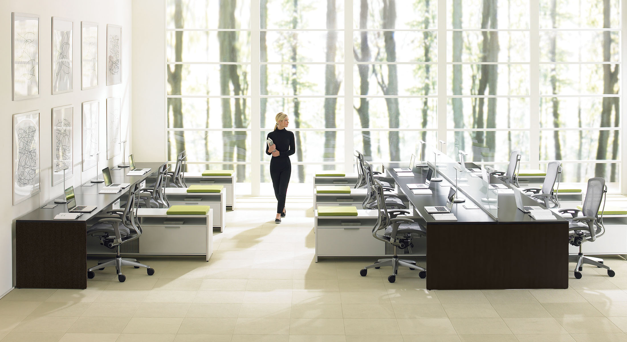 Expansion Desking uses the same collection of products to achieve varied applications, from open-plan collaborative configurations to private offices with a casegoods look, promoting integration of finishes and components and reducing overall inventory.