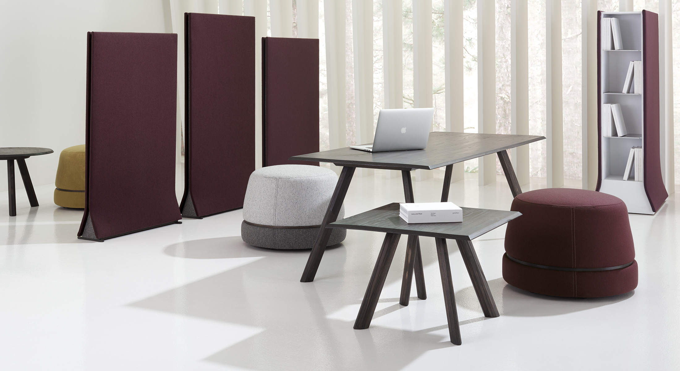 Ottomans are available in three diameters, the smallest with optional casters and the largest with optional USB power. Contrasting textile applications allow various configurations. The Qui table collection is offered in a wide range of heights, sizes and configurations, and is available in six different wood finishes. Screens divide environments and create private meeting spaces.