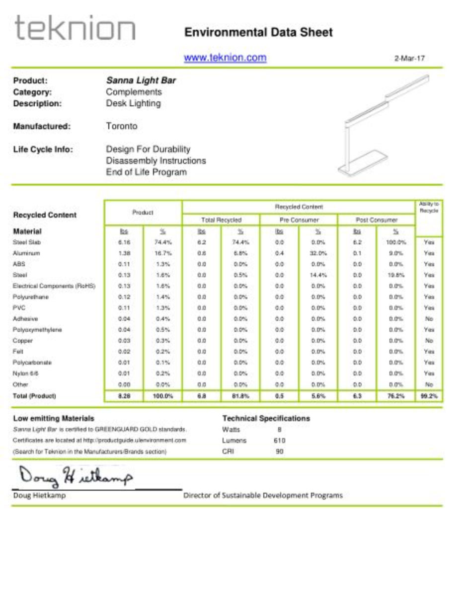 Advancing sustainability has always been a cultural imperative within our company, supported at both an individual and corporate level. The challenge moving forward is to find the opportunities, choose the right initiatives, and to not just push the narrative, but also the reality of sustainability forward. Our priorities as a manufacturer are to minimize the environmental impact of our activities, and to provide educational outreach to advance sustainability for our industry. Culturally we are hardwired to flex and collaborate. We respond to clients’ needs and vision, and balance those against third-party auditing and certification programs. We carefully survey new and emerging standards to understand their relevance in helping advance sustainability. We don’t chase certifications. We use our standards to support our clients’ goals, objectives and expectations. Most importantly, we are then able to challenge our thinking and broaden our understanding and perspective. By doing this we often go further. You will see examples in our report where employee initiatives have taken us beyond what is prescribed by our corporate goals and certification guidelines. We have the privilege of working with some of the most innovative companies in the world. Their vision for the future of work combined with our capabilities and knowledge has driven us to make things that set a precedent for a better way forward. We have come far but there is still much work to be done. I look forward to doing that work alongside every employee in this outstanding company.