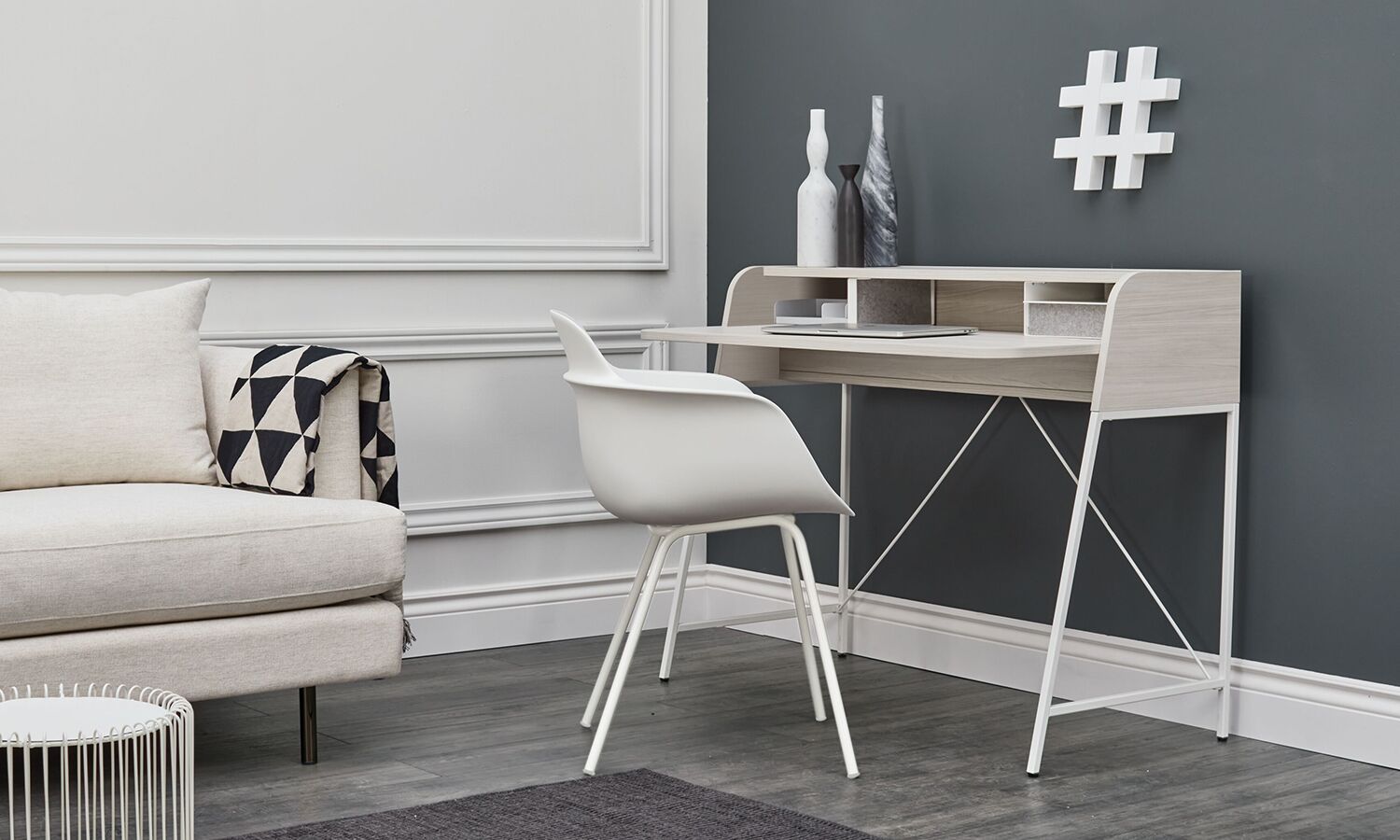 - Blanc et léger – bureau Ivory Birch et pieds Atrium White