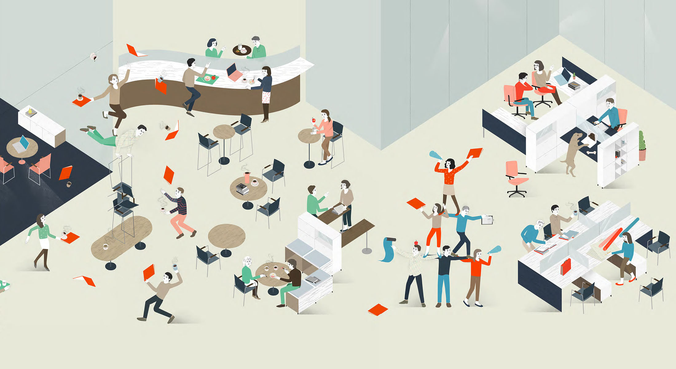 Il faut organiser l’espace pour optimiser la circulation et planifier des endroits qui favorisent les « rencontres fortuites ». Le bureau-paysage est comparable aux environnements urbains qui manquent de lieux de rassemblement public à vocation mixte et ainsi, n’incite pas à la marche ou à la socialisation. En revanche, dans les villes où l’on trouve des places publiques entourées d’entreprises de toutes sortes, de même que dans les quartiers résidentiels, les gens se réunissent fréquemment pour magasiner, manger, socialiser et assister à des évènements. Bon nombre d’urbanistes créent désormais ce type d’endroit convivial pour les piétons pour revitaliser les quartiers en dégradation; une démarche similaire en matière d’aménagement de bureaux permet aussi de mobiliser les employés et d’accroitre l’interaction.