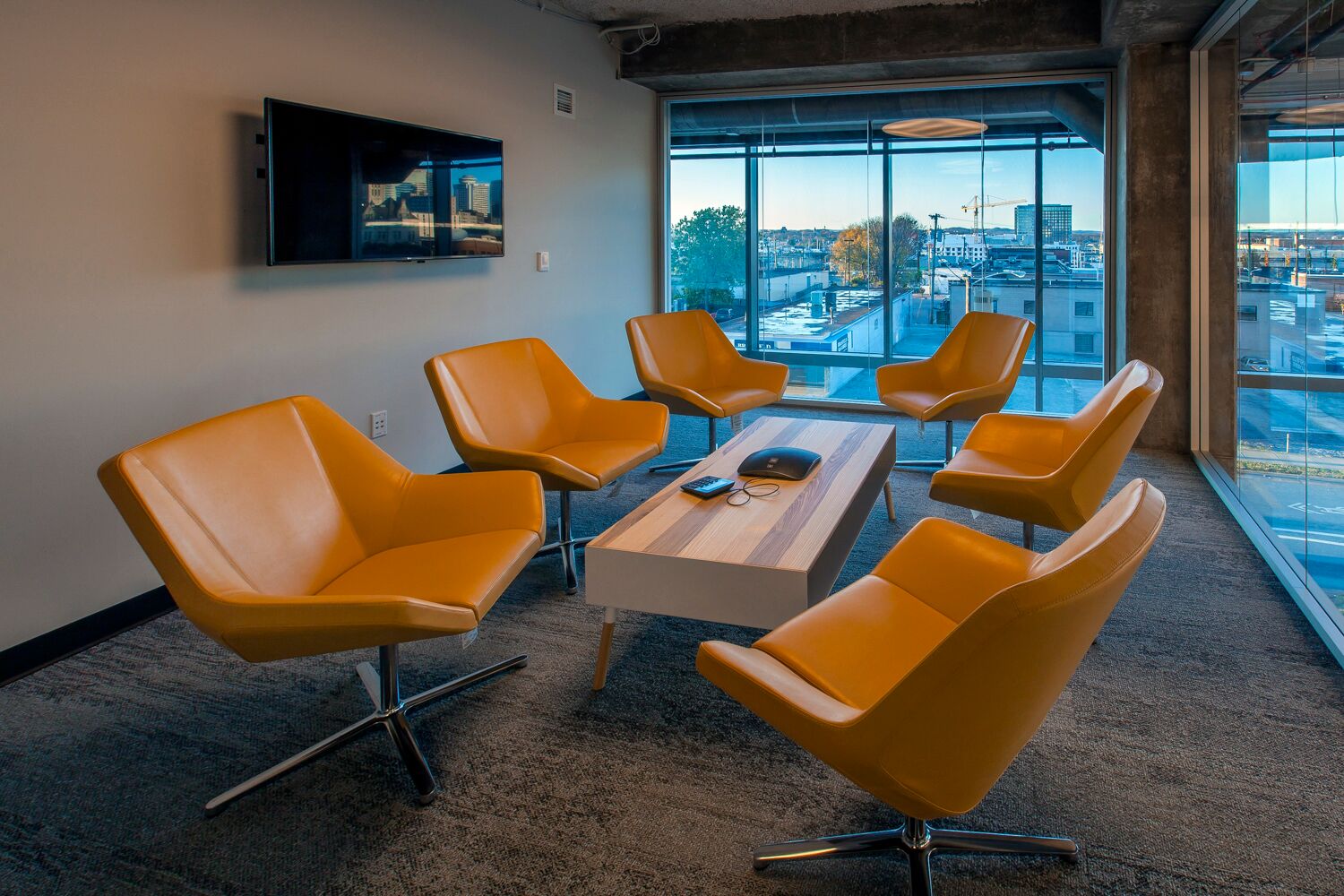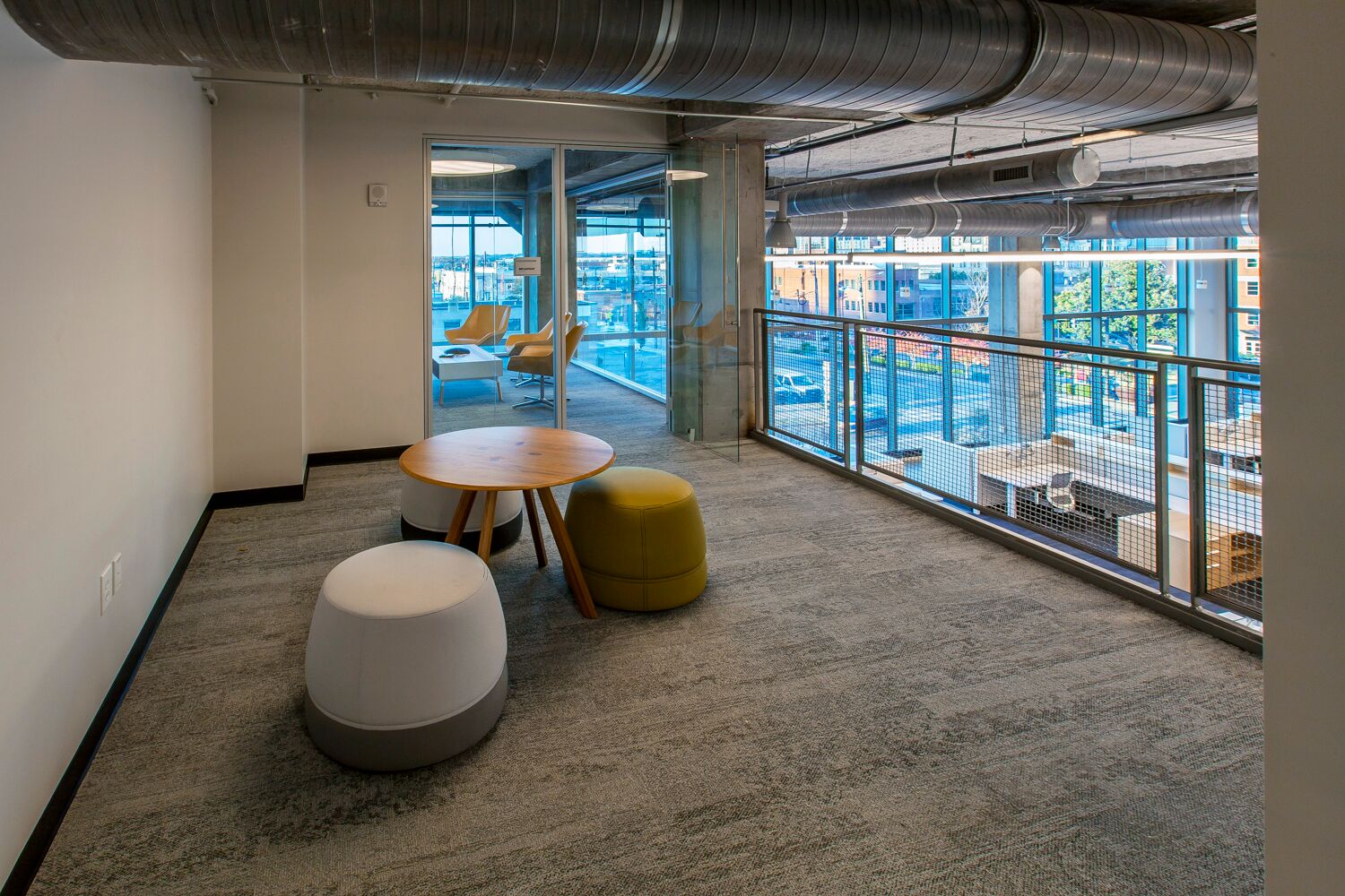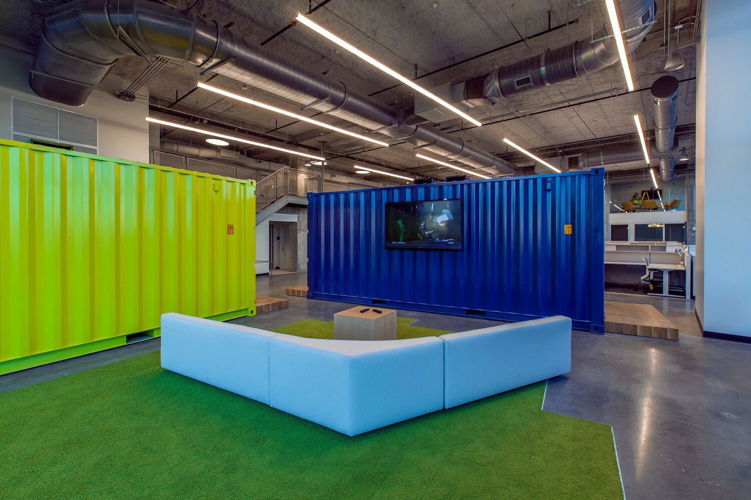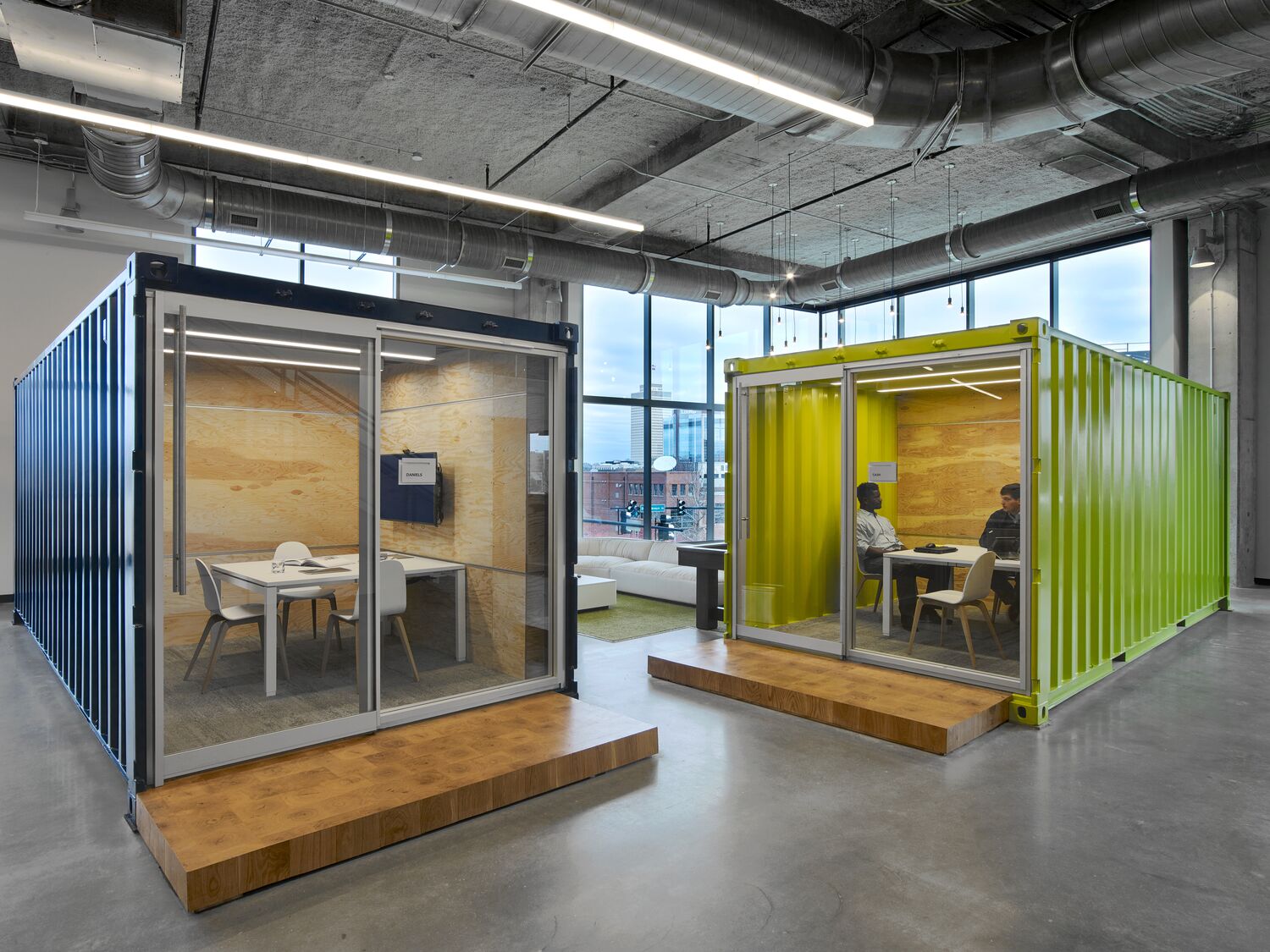 Hastings also designed some more traditional meeting rooms, including several spaces on a mezzanine level that overlooks the main workspace below, and a conference room with a stunning, wood-truss cathedral ceiling. It’s one of Spaulding’s favorite design elements, as it perfectly captures the juxtaposition of refined, warm wood with the rough, raw construction materials.