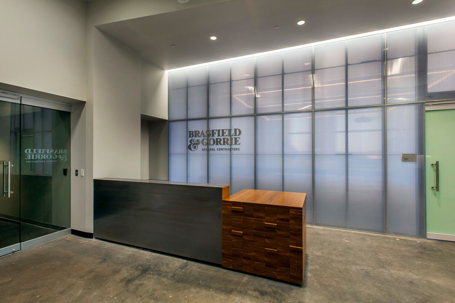 While about 80 percent of the office features open plan workstations, there was also a need for some private offices, which are set to the core with Teknion Optos glass fronts to allow for light penetration. “If/when Brasfield & Gorrie needs to morph the space, the flexible system will let them move walls, and if they need to change some of those glass-fronted offices into free
