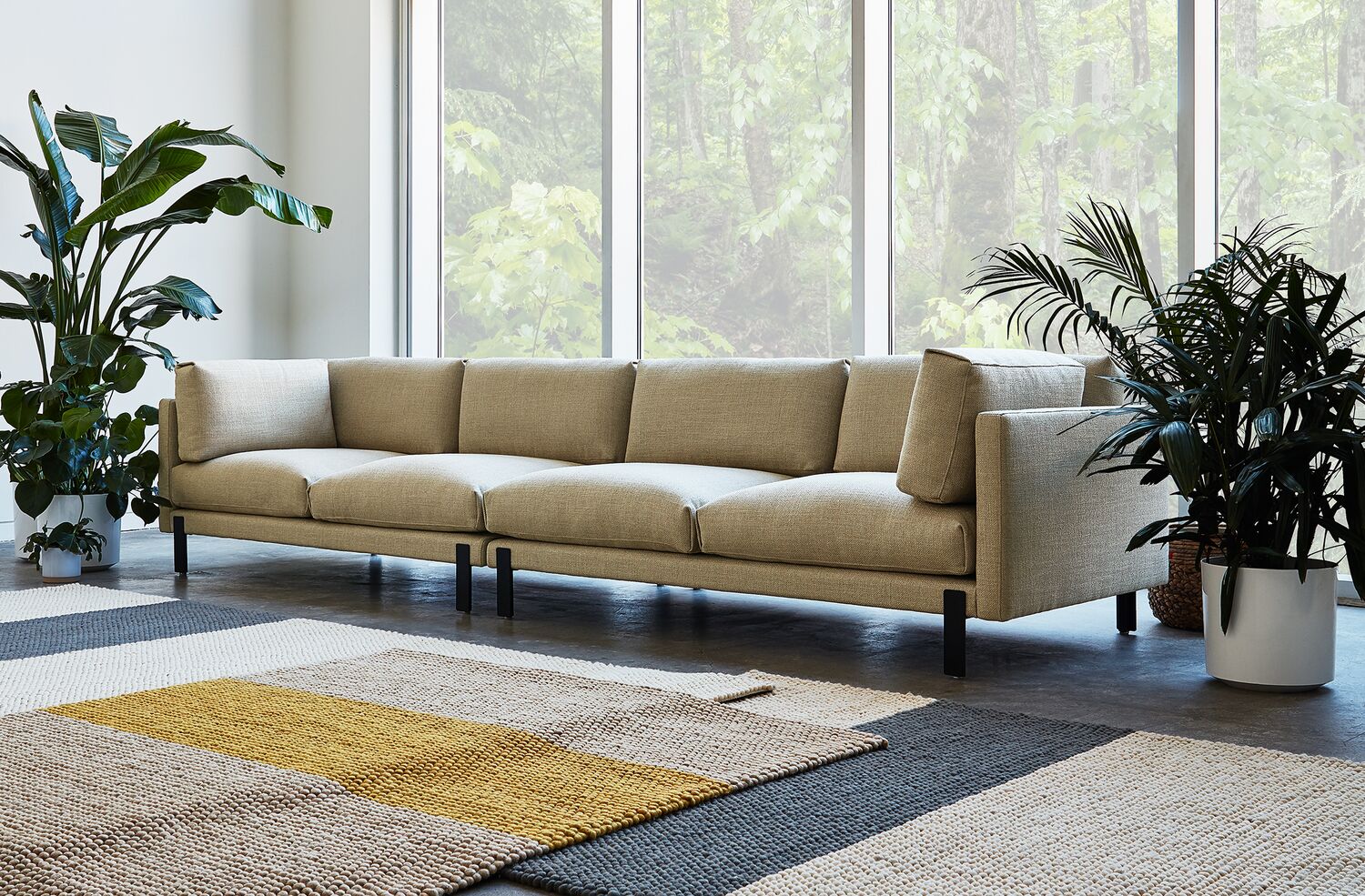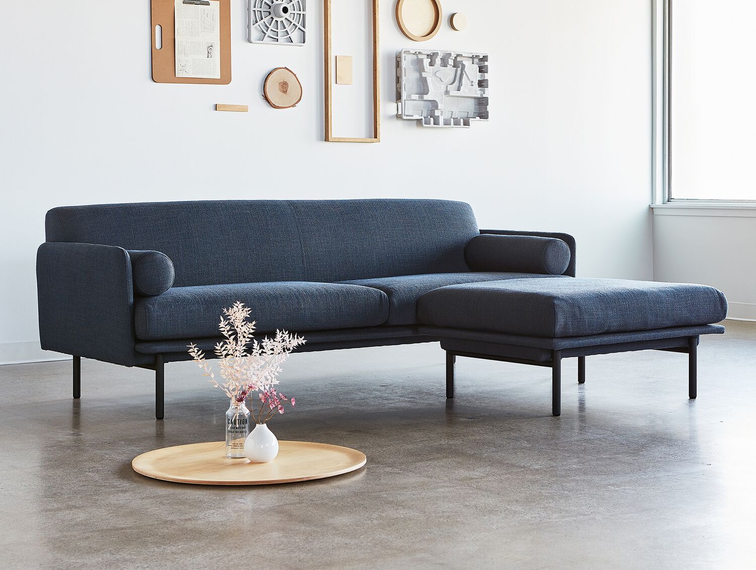 The Foundry Upholstery Series showcases tailored minimalism with details that elevate fashion and function to suit any residential or commercial setting. Inspired by elements of classic Scandinavian design, the Foundry Bi-Sectional offers ample sophistication as a standalone piece, showcasing striking lines, an extra slender tightback frame and cushions that seem to float above elevated, cylindrical steel legs. Two bolsters offer additional style and comfort, while the sturdy, steel reinforced FSC®-Certified frame ensures that Foundry holds up in high-traffic environments.