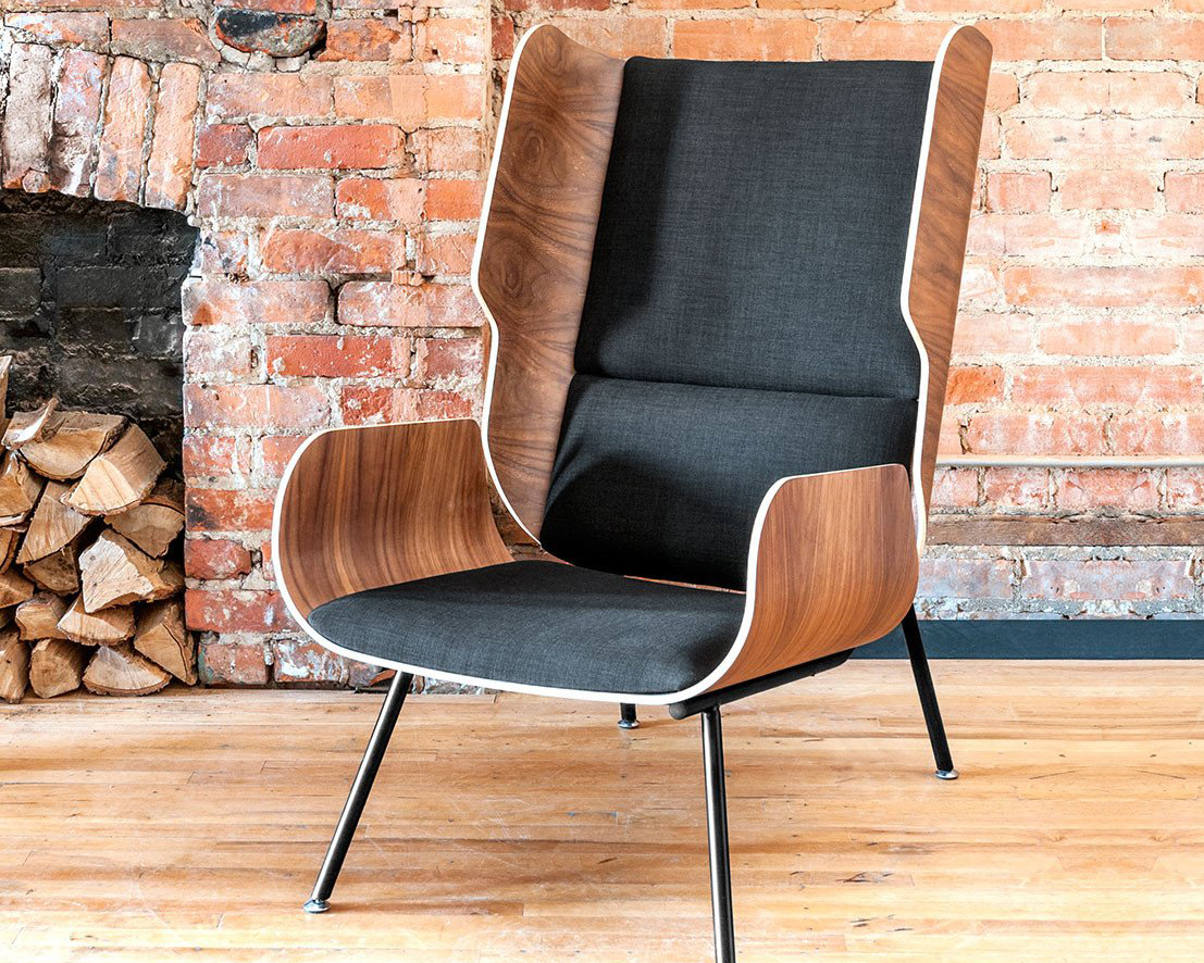 The Halifax is a contemporary accent chair with a laid-back, industrial feel. Faceted upholstery panels rest on a precision welded, powder-coated steel frame. Walnut-finished paddle armrests help soften the strong lines of this unique design.