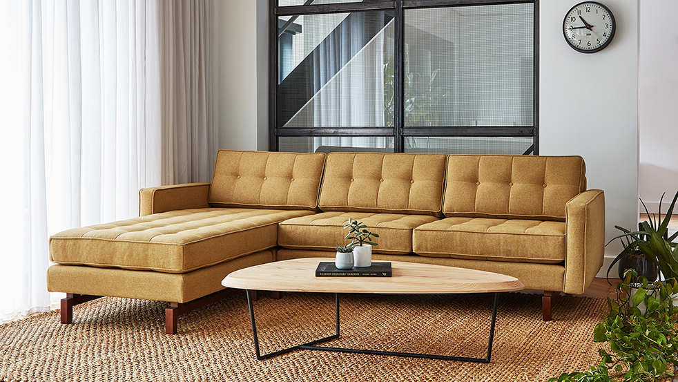 The Adelaide Bi-Sectional is a classic, symmetrical design that harkens back to Mid-century archetypes. Structured side cushions lend a vintage look, and provide added comfort. The solid, tapered-wood legs can be easily removed and reattached, allowing this sectional to fit through tight spaces.