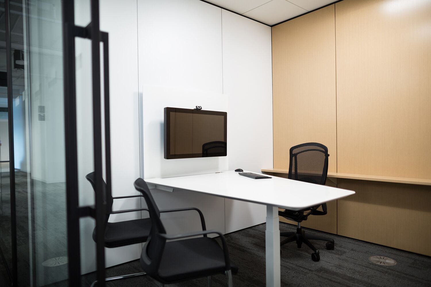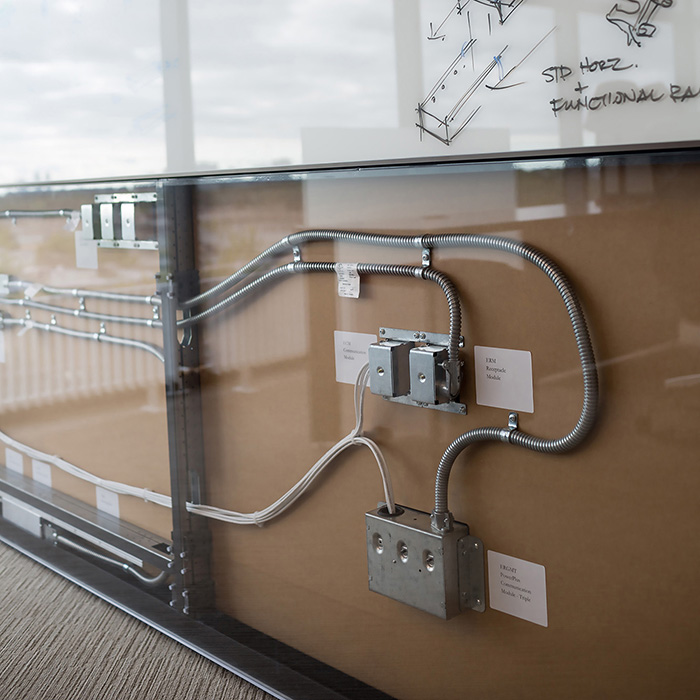 Technology can be easily integrated into any of our wall programs. Room schedulers such as iPads and third-party security technology can be integrated onto any of our frames without compromising the aesthetic. Tek Pier provides a fully integrated, technology supported workspace that has been integrated into the Altos frame structure. Its movable display on a height-adjustable worksurface provides an ergonomic collaboration experience. Tek Pier provides superior integration of technology to facilitate collaboration and electrical access for users (HDMI, USB, Power). The shroud effectively hides cords and excess wires to maintain a clean and organized surface at all times. Altos walls are 4 inches thick with 2½" of accessible, clear cavity space that allows wires to be run horizontally and vertically. Altos accepts three types of electrics, both hard-wired and quick-disconnect systems; as well as standard off-the-shelf UL/CSA approved boxes. All of Altos removable fascias provide accessible access to building for servicing and electrical inspections.