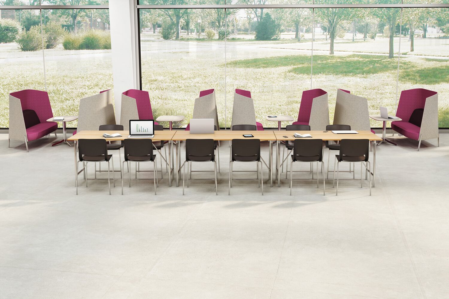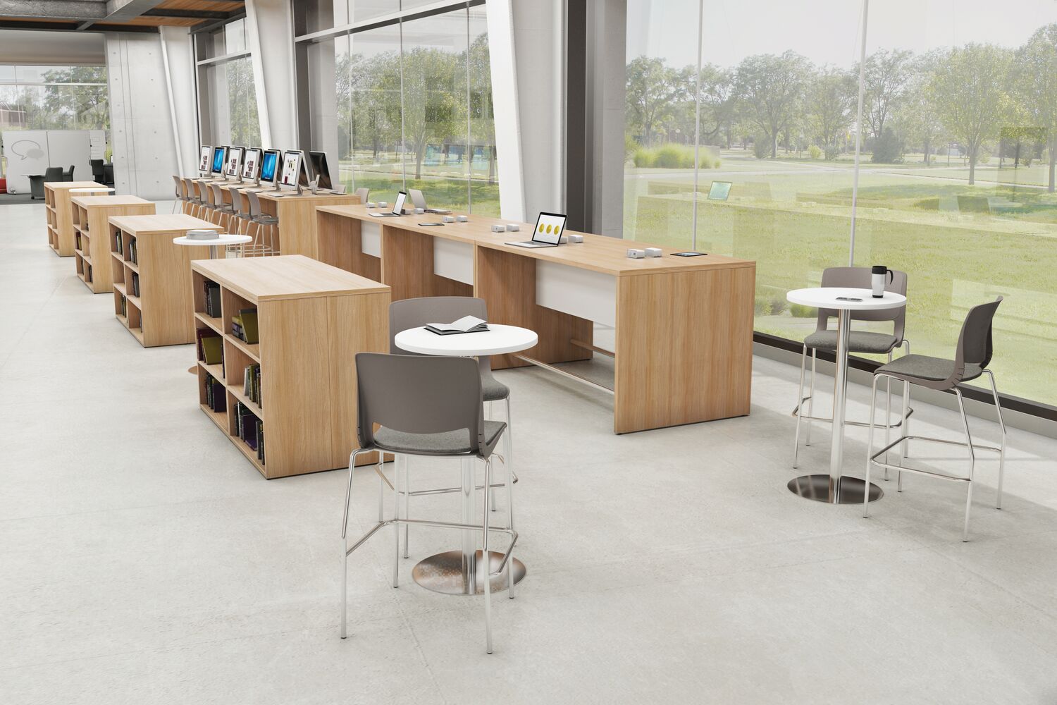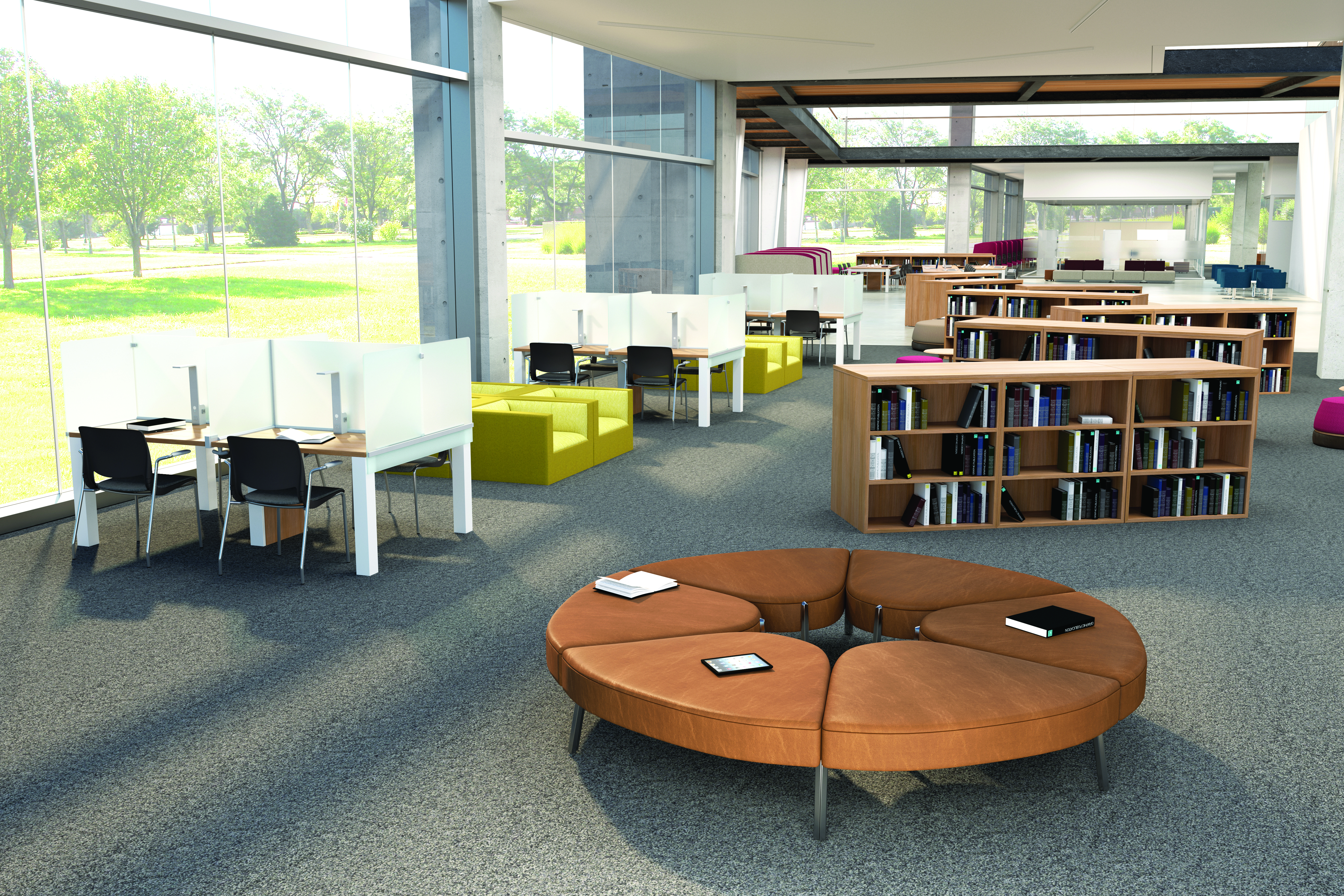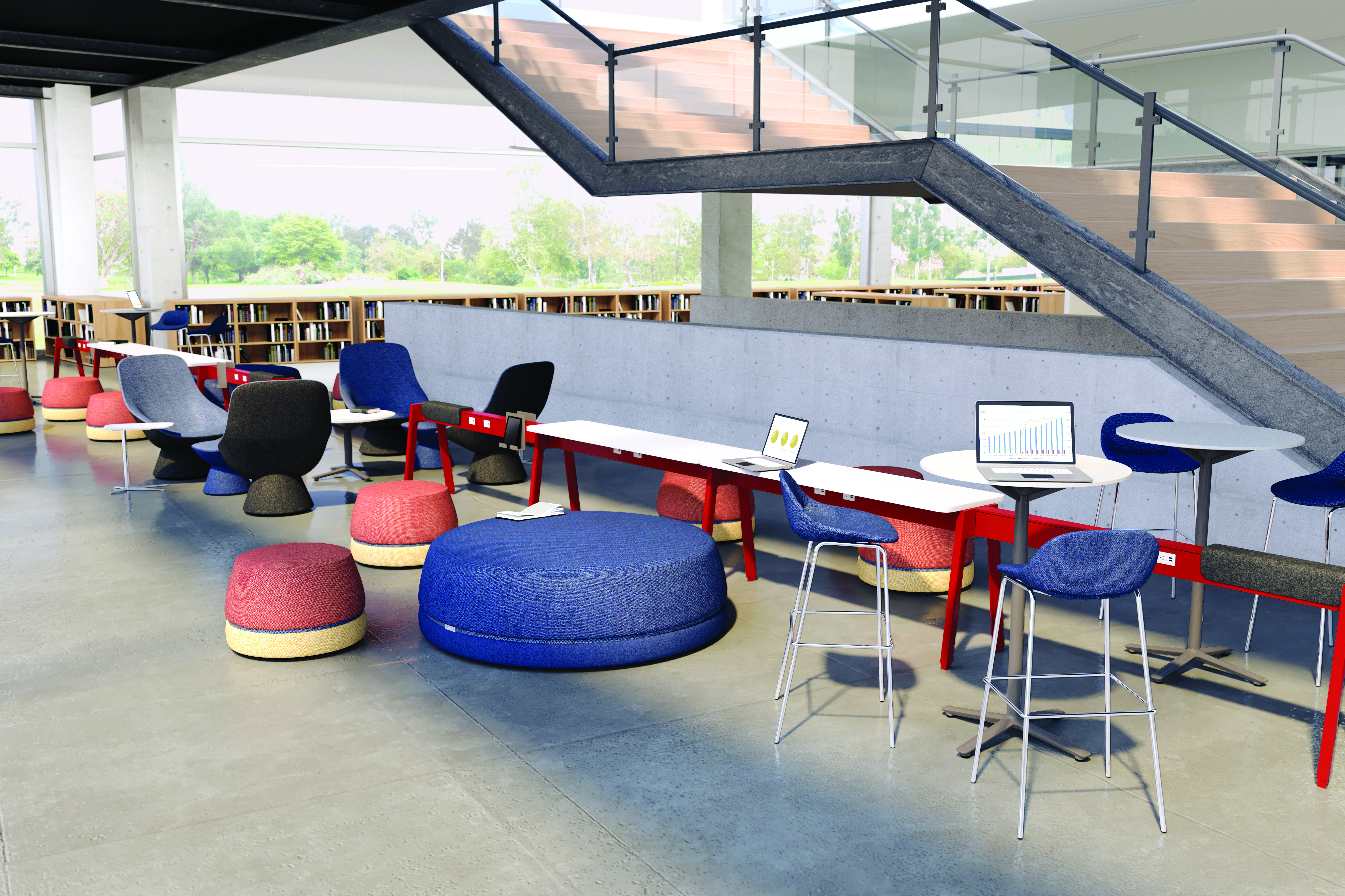 Within the library, space must often serve a variety of programmatic needs: seminars and colloquiums, readings, social events and student, staff or faculty meetings. Furnished with lightweight, mobile tables and chairs, a room frequently used for faculty meetings can be quickly reconfigured for an academic conference or a reception for a distinguished visitor. These spaces can also be used by student organizations as a place to plan campus events and activities. Flip-top tables, nesting tables and stacking chairs are easy to move around or to store, while lounge furniture and café height tables contribute to comfort and ease.