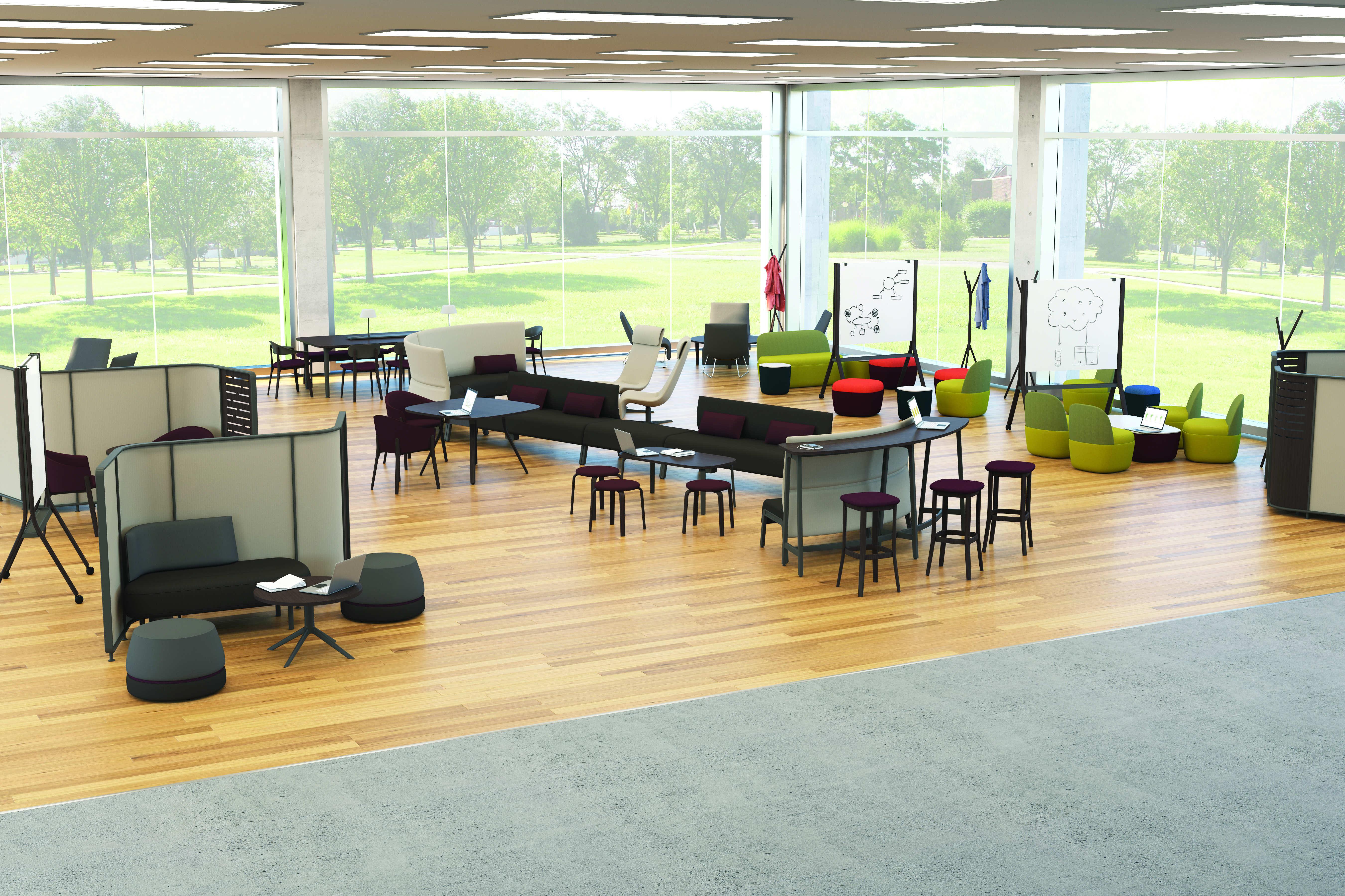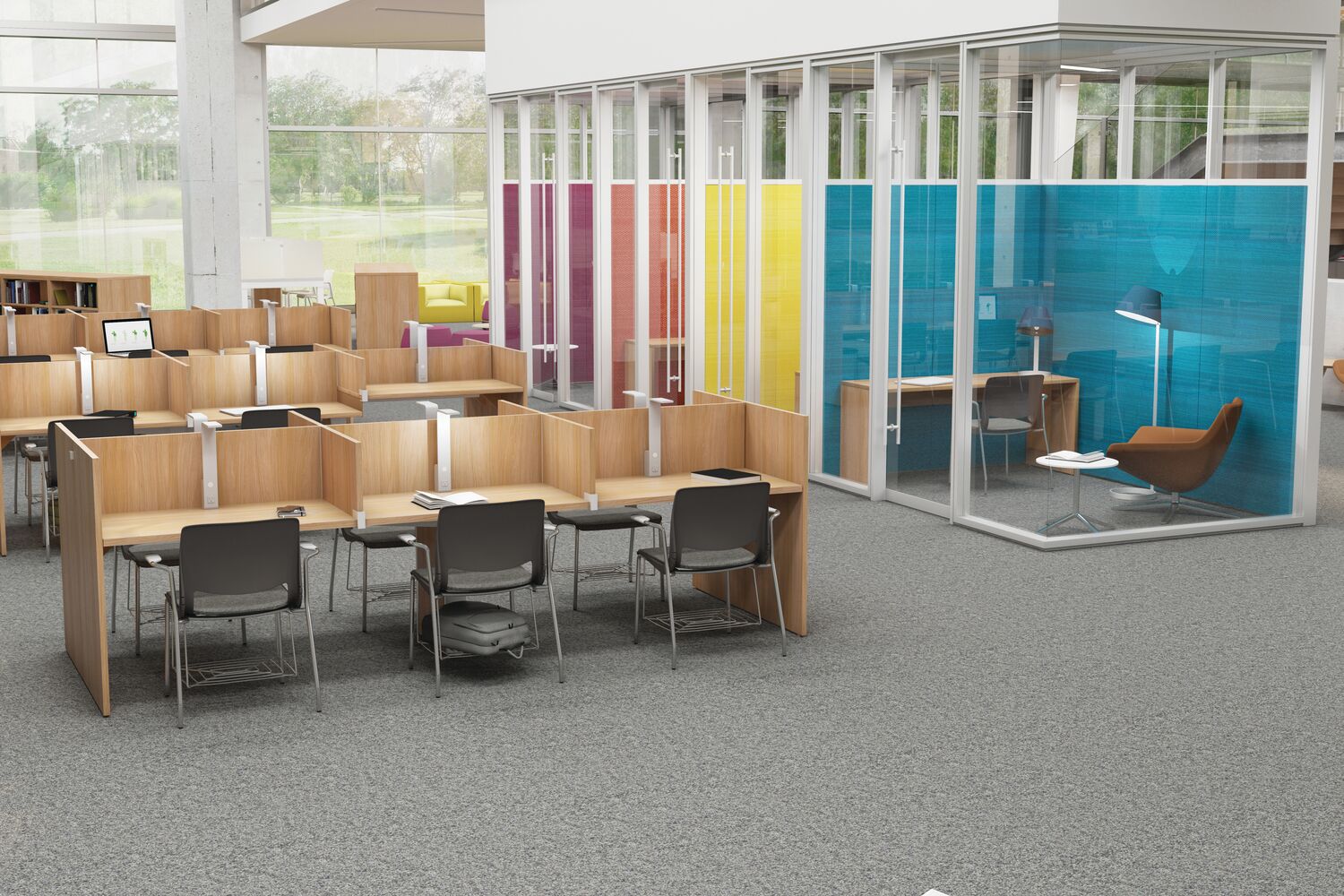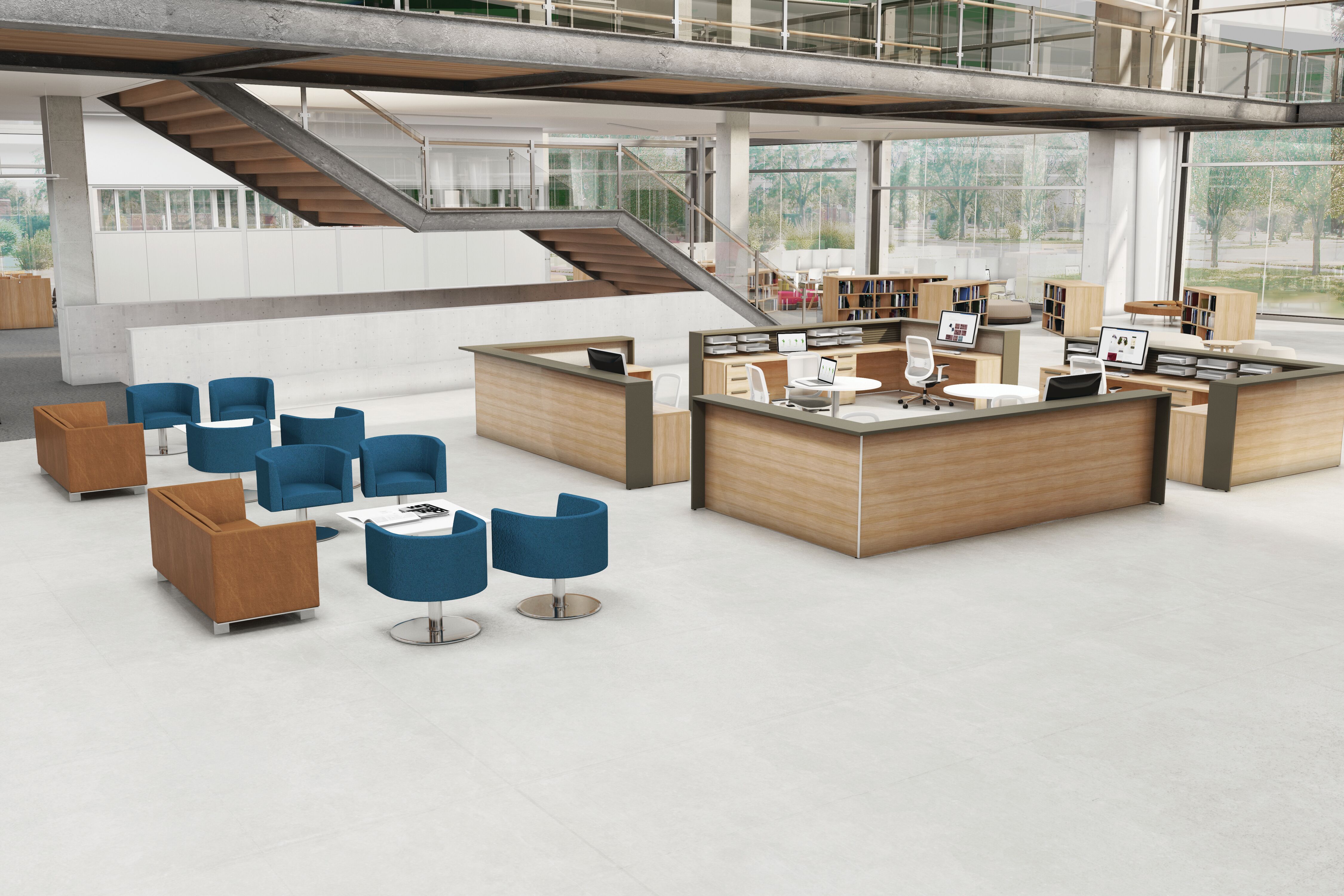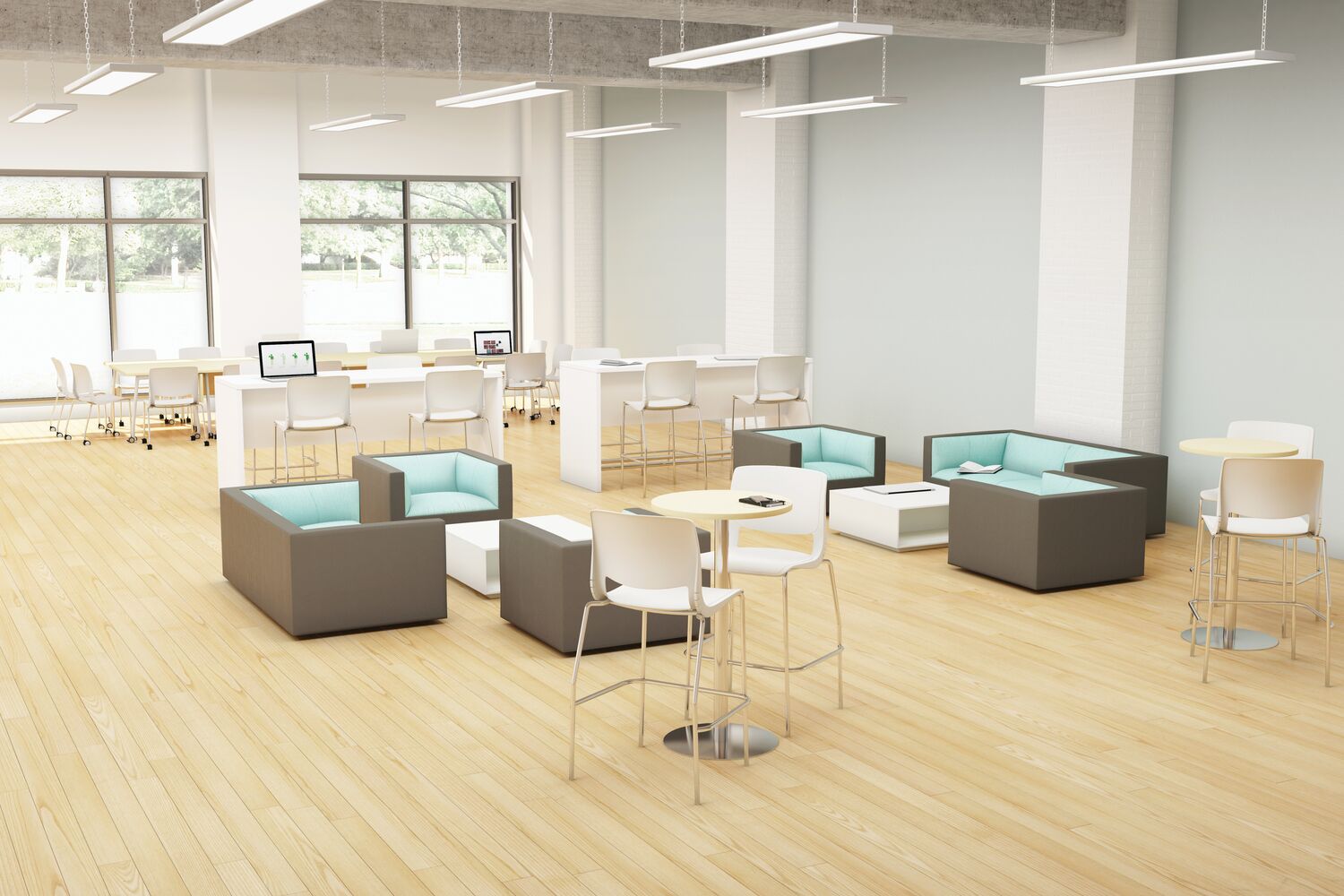 Within the library, space must often serve a variety of programmatic needs: seminars and colloquiums, readings, social events and student, staff or faculty meetings. Furnished with lightweight, mobile tables and chairs, a room frequently used for faculty meetings can be quickly reconfigured for an academic conference or a reception for a distinguished visitor. These spaces can also be used by student organizations as a place to plan campus events and activities. Flip-top tables, nesting tables and stacking chairs are easy to move around or to store, while lounge furniture and café height tables contribute to comfort and ease.